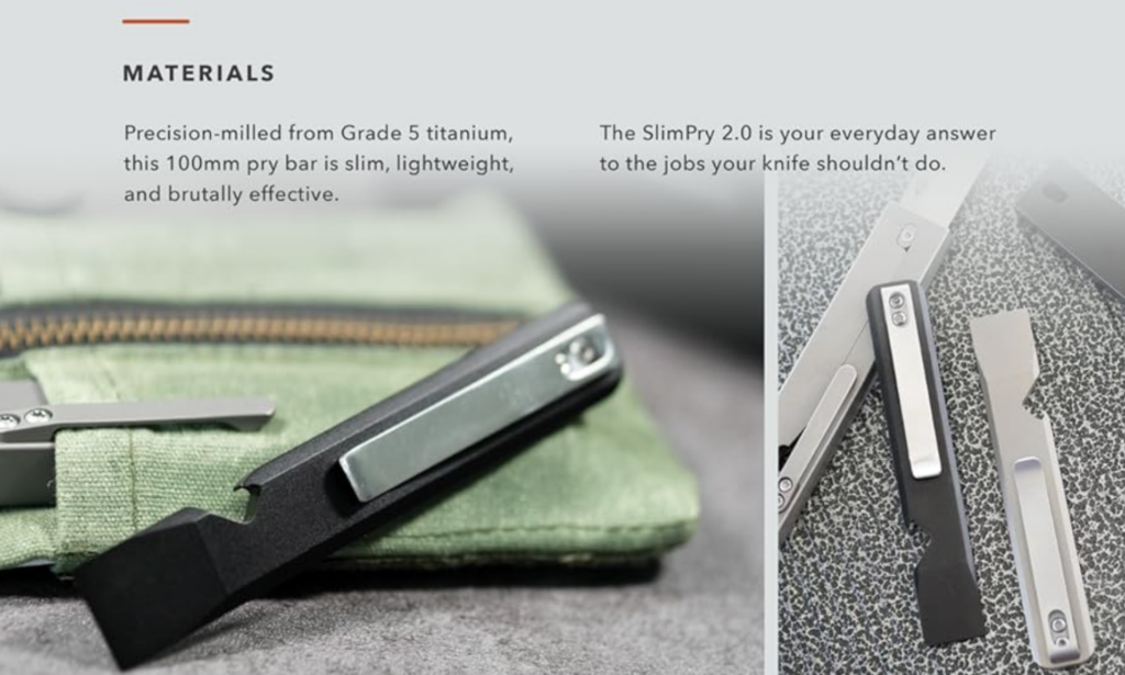 صُنعت آلة SlimPry الدقيقة باستخدام الحاسب الآلي باستخدام الحاسب الآلي من التيتانيوم من الدرجة 5 (من النوعية المستخدمة في مجال الطيران)، وهي مقاومة للتآكل وغير مغناطيسية ومصممة لتدوم طويلاً. يتفادى التصميم البسيط الحيل “التكتيكية” من أجل سهولة الاستخدام الحقيقي، مع قبضة مصقولة تعطي شعورًا طبيعيًا في اليد. يُطوّر التيتانيوم طبقة فريدة من الزنجار مع مرور الوقت، مما يجعل كل أداة مميزة لك. مدعومة بضمان مدى الحياة، إنها من أدوات الحمل اليومية التي تُستخدم باستمرار ولكنك لا تفكر فيها أبدًا - إلى أن تحتاج إليها فتجدها هناك.