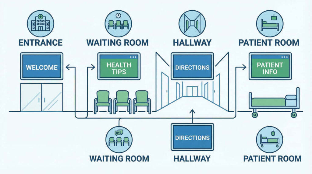 Most hospitals already have screens scattered around their buildings. Some work well. Others just loop the same generic health tips nobody reads.