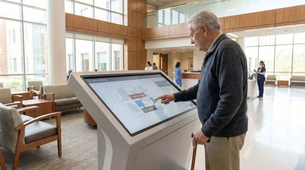 Interactive touchscreens at main entrances help people find where they’re going without asking. The good ones show department locations, doctor offices, parking areas, and can even send directions to someone’s phone.