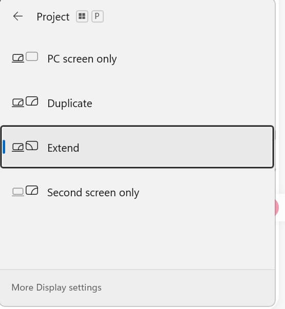 • التهيئة: الصحافة مفتاح ويندوز + P لاختيار مكررة, تمديدأو الشاشة الثانية فقط.