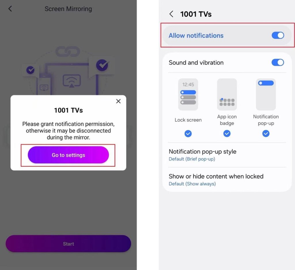 Før du begynder, skal du give notifikationstilladelse i Indstillinger. Eller appen kan også anmode om denne tilladelse til at overvåge din forbindelsesstatus i meddelelseslinjen.