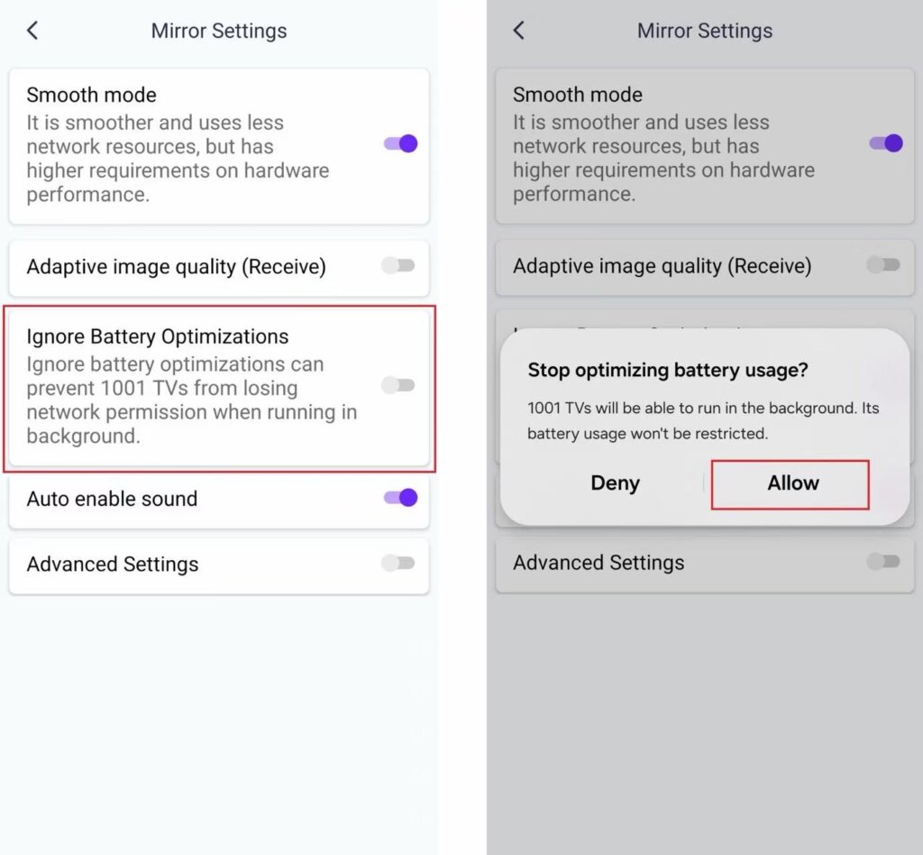 Slå dette til for at forhindre, at batteribesparende funktioner afbryder din skærmspejling.