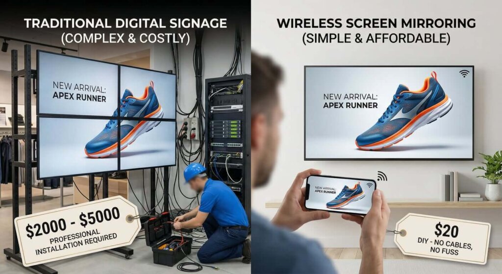 Cost Barriers: Professional digital signage systems typically start at $2,000-$5,000 per screen, plus installation fees, content management software subscriptions ($50-$200/month), and ongoing maintenance contracts.