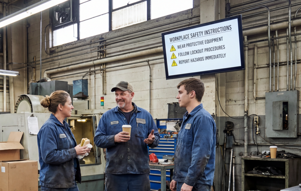 Safety is the #1 priority. Digital signs can loop safety reminders or show “days without an accident” to keep morale high. In an emergency, these screens can instantly switch to show exit routes or hazard warnings.