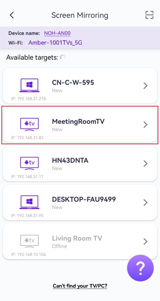 Nota: Asegúrese de que el dispositivo de TV está ejecutando la aplicación y actualice la lista si es necesario.