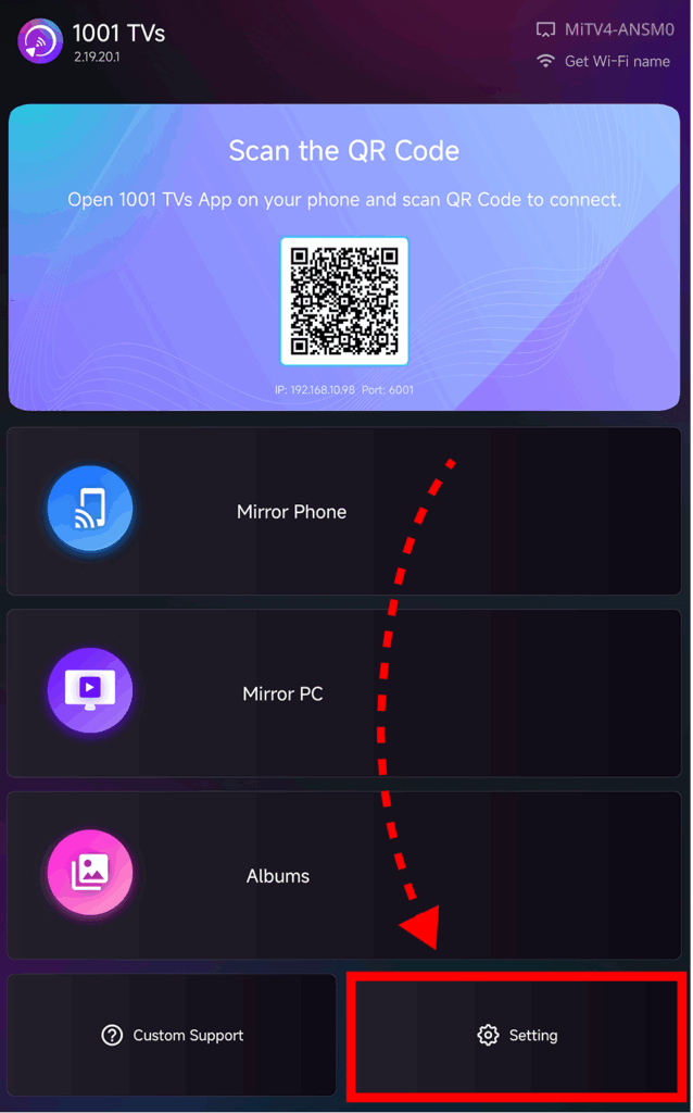 1.Conecta el mismo Wi-Fi Asegúrate de que tanto el teléfono como el televisor están conectados a la misma red Wi-Fi. (Se recomienda una conexión Wi-Fi de banda 5G para obtener el mejor rendimiento). 2.Instalar y abrir 1001 TVs Asegúrese de instalar 1001 TVs tanto en el teléfono como en el televisor. 📥 Versión para TV: Descargar desde Google Play Store 📱 Versión Android: Descargar desde Google Play 3. Iniciar la duplicación Puedes iniciar la duplicación utilizando uno de estos dos métodos: 1) Escanear código QR Puedes escanear el código QR para iniciar la duplicación.(Nota: Tendrás que conceder permiso a la cámara la primera vez que escanees.) Una vez que el escaneo se haya realizado correctamente, podrás iniciar la duplicación de pantalla. 2) Selecciona Dispositivos Cercanos 1001 TVs detectará automáticamente dispositivos como smart TVs, TV boxes y PCs conectados a...