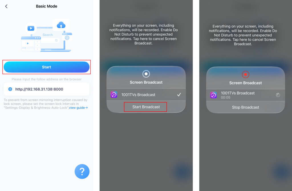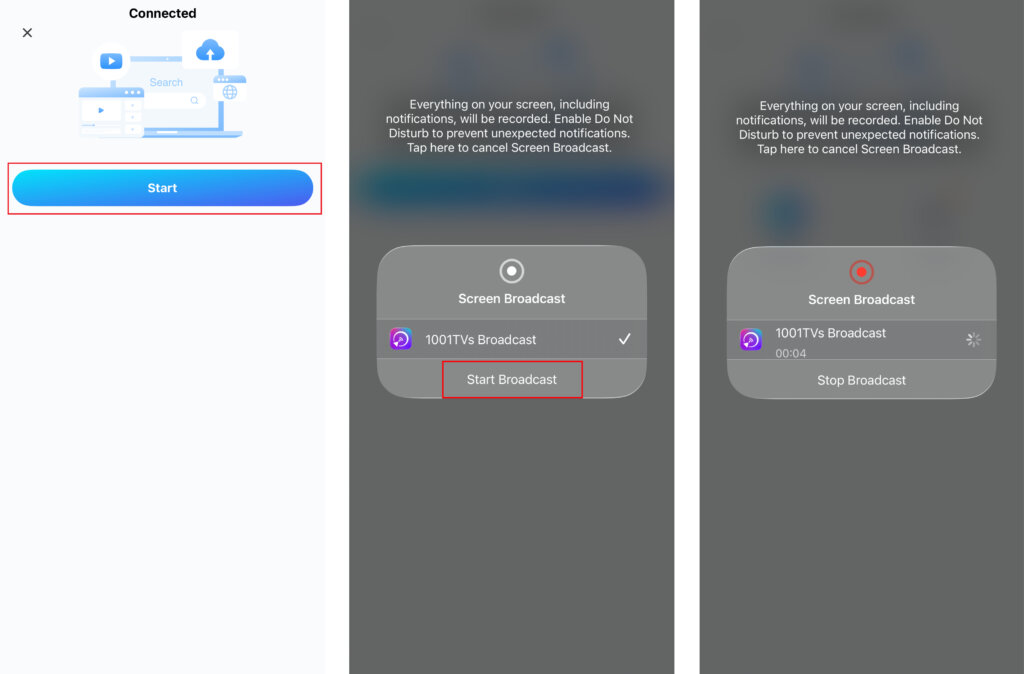 - Une fois la connexion établie, appuyez sur "Démarrage" > "Début de la diffusion”.
