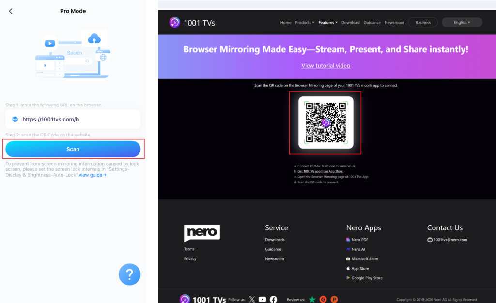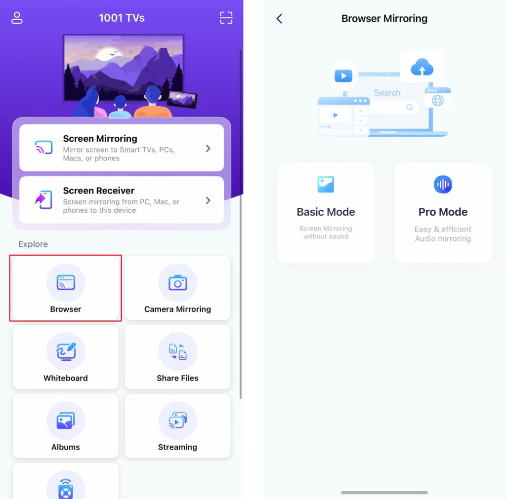 Pour refléter l'écran de votre téléphone dans un navigateur, il vous suffit d'utiliser la fonction 1001 TVs sur votre iPhone.
