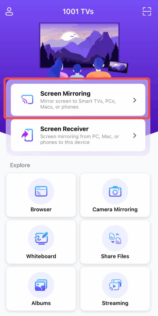 Open the 1001 TVs app on your phone, then choose “Screen Mirroring”.