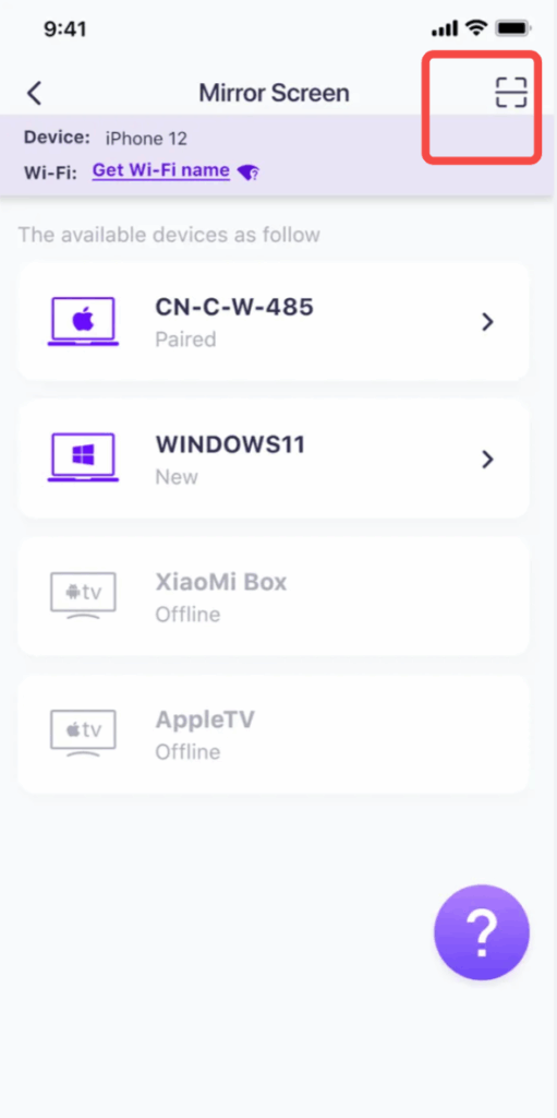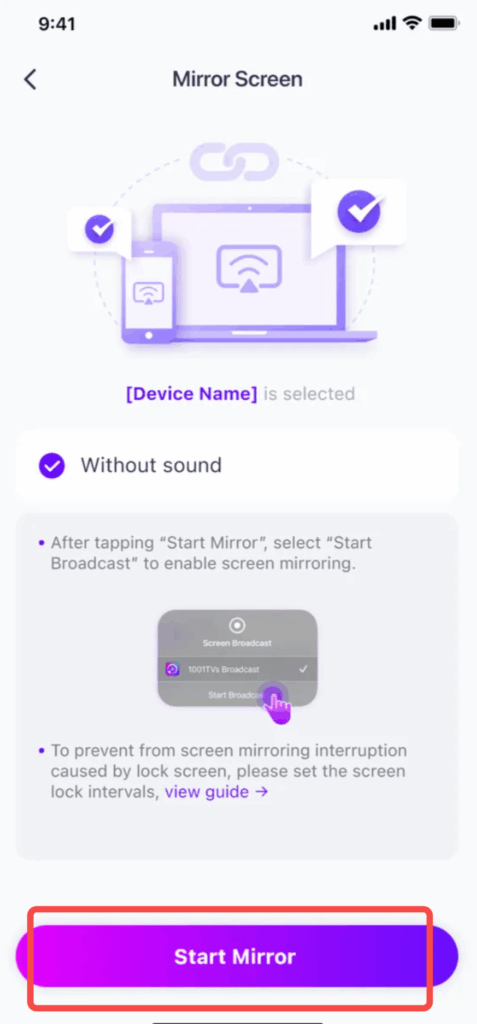 After confirming on your TV, go back to your phone and tap the purple [Start Mirror] button.