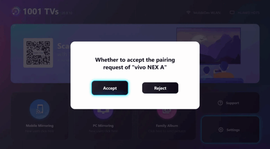 You can either select your device from the list or scan the QR code shown on your TV to start the connection.