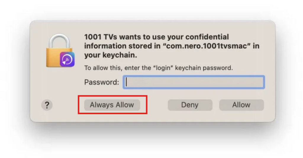 When prompted for a password, enter your Mac’s login password to allow the changes and select “Always Allow” .