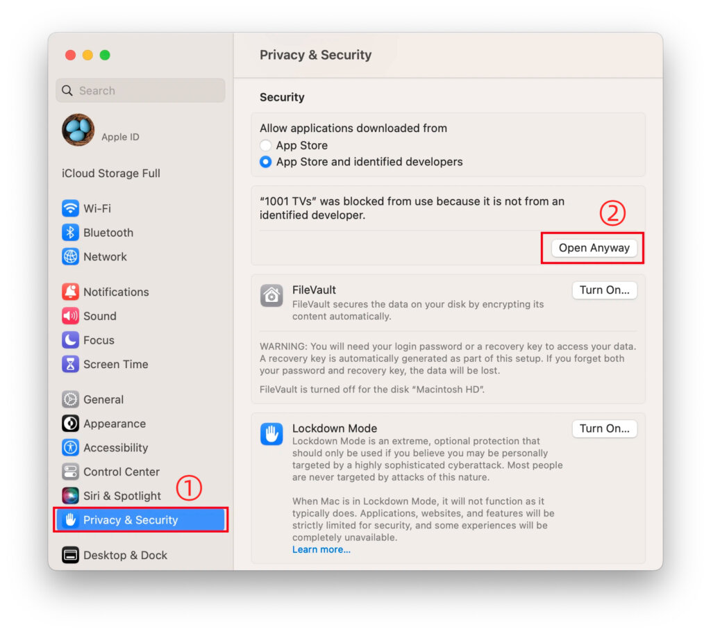 · Go to “Settings” > “Privacy & Security” and select “Open Anyway” to proceed.