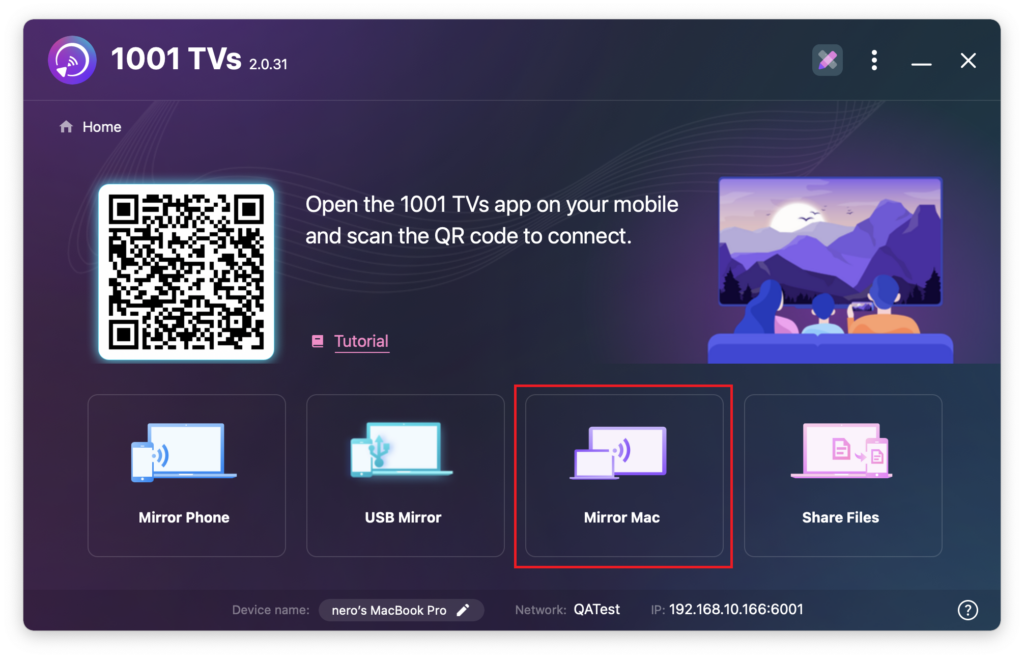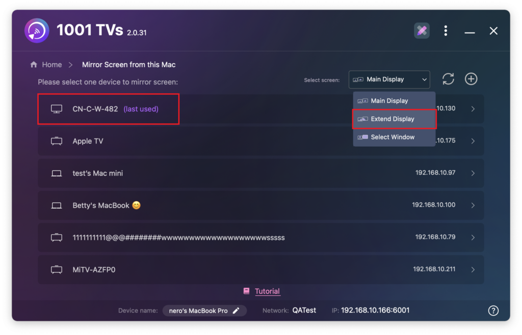1) Select “Mirror Mac” > “Extend Display”.