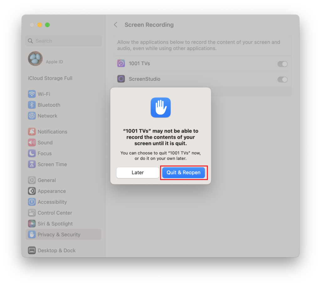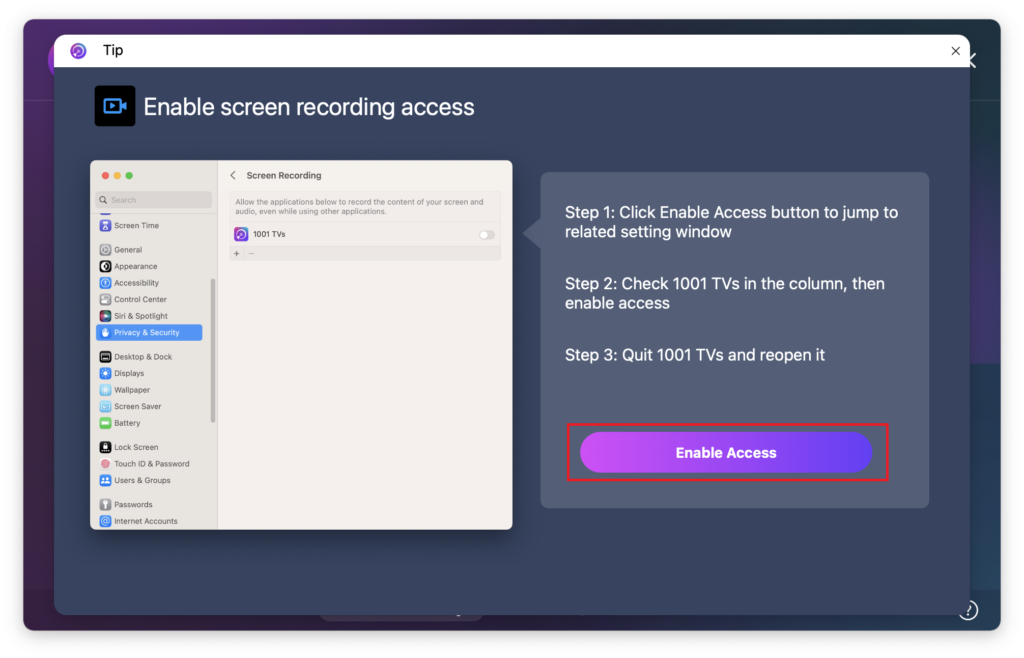 If permissions are already enabled but the “Enable screen recording access” pop-up still appears: