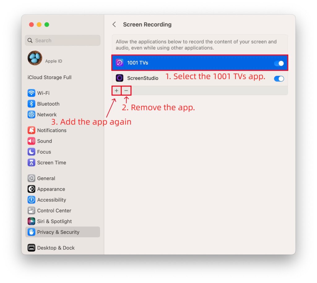 1) Remove 1001 TVs app from the permissions list by clicking the – icon.