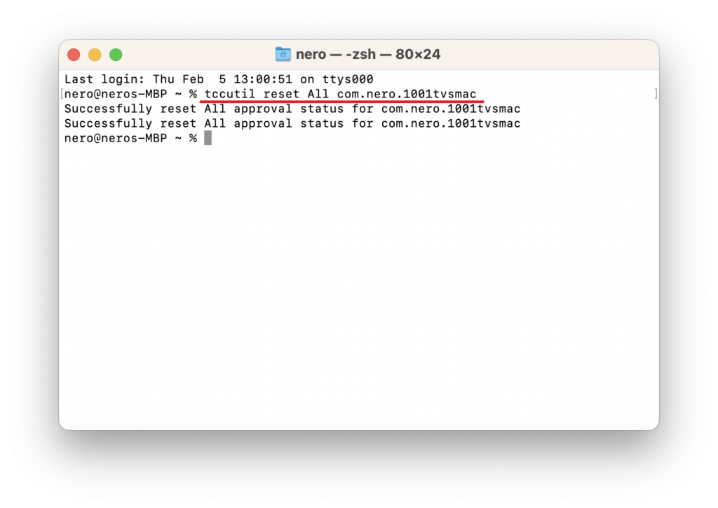 3) Enter the following command: tccutil reset All com.nero.1001tvsmac