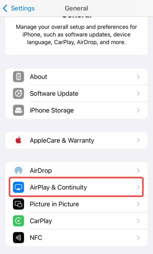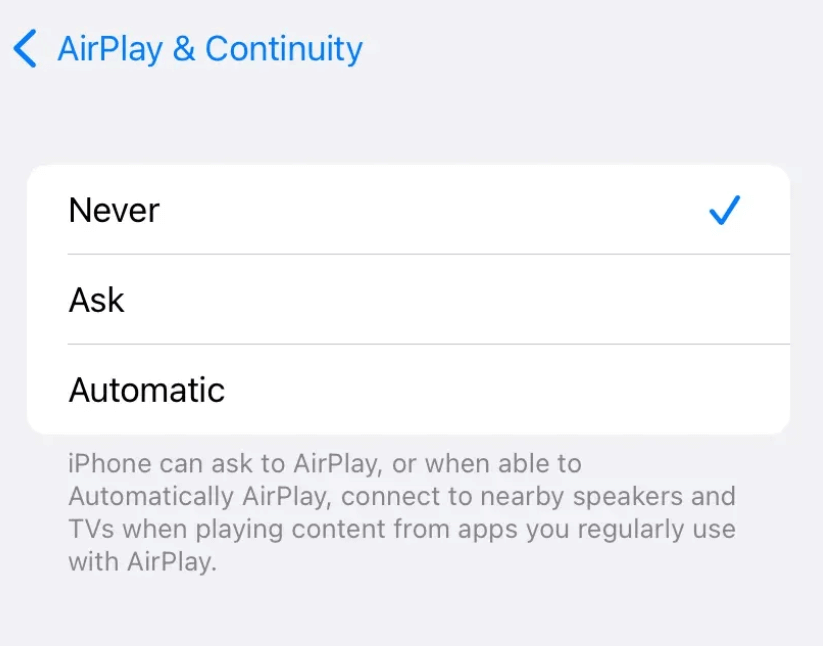 1. Set Automatisch AirPlay to “Never” on your iPhone/iPad (Settings > General > AirPlay & Continuity)