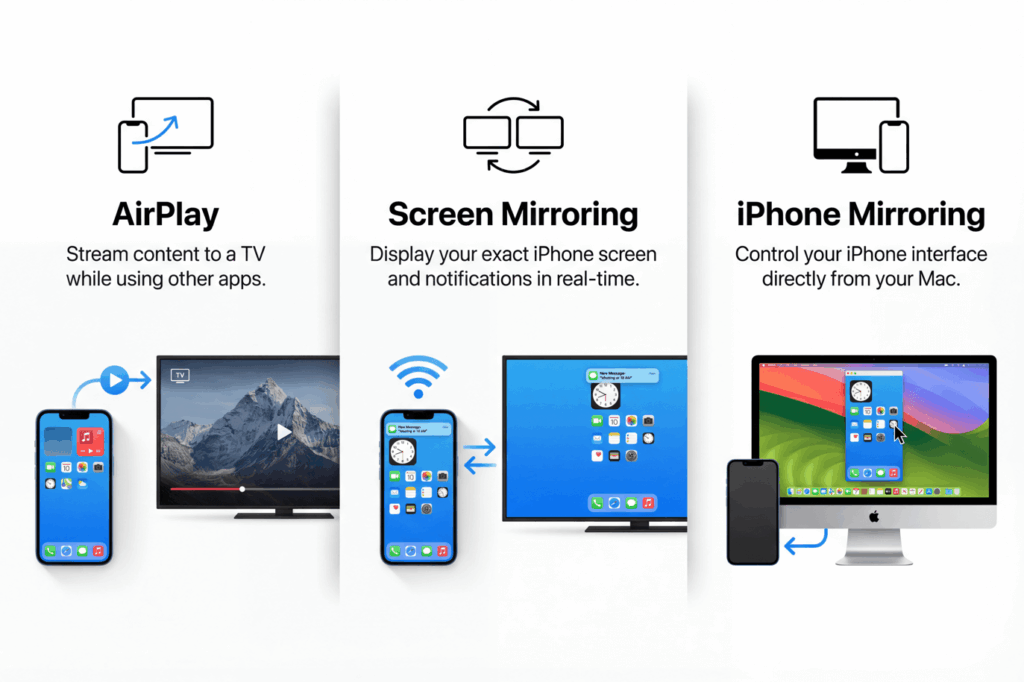 AirPlay streamt specifieke inhoud (zoals een video of nummer) naar een ander apparaat. Je telefoon blijft actief en je kunt andere dingen doen terwijl de inhoud elders wordt afgespeeld.