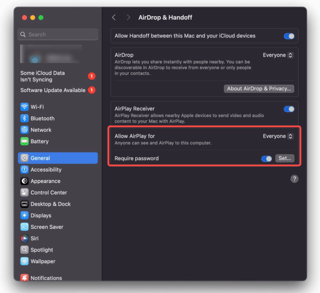 If you want to keep it on but add security, leave it enabled and set “Allow AirPlay for” to “Current User” (only your devices) or enable “Require password” so people can’t cast to your Mac without permission.