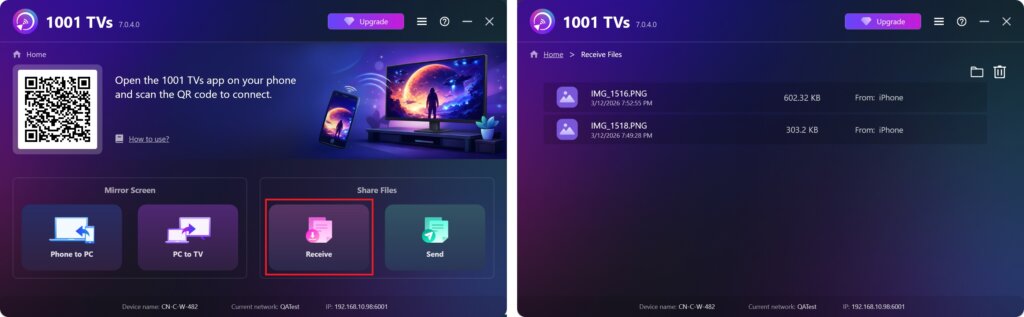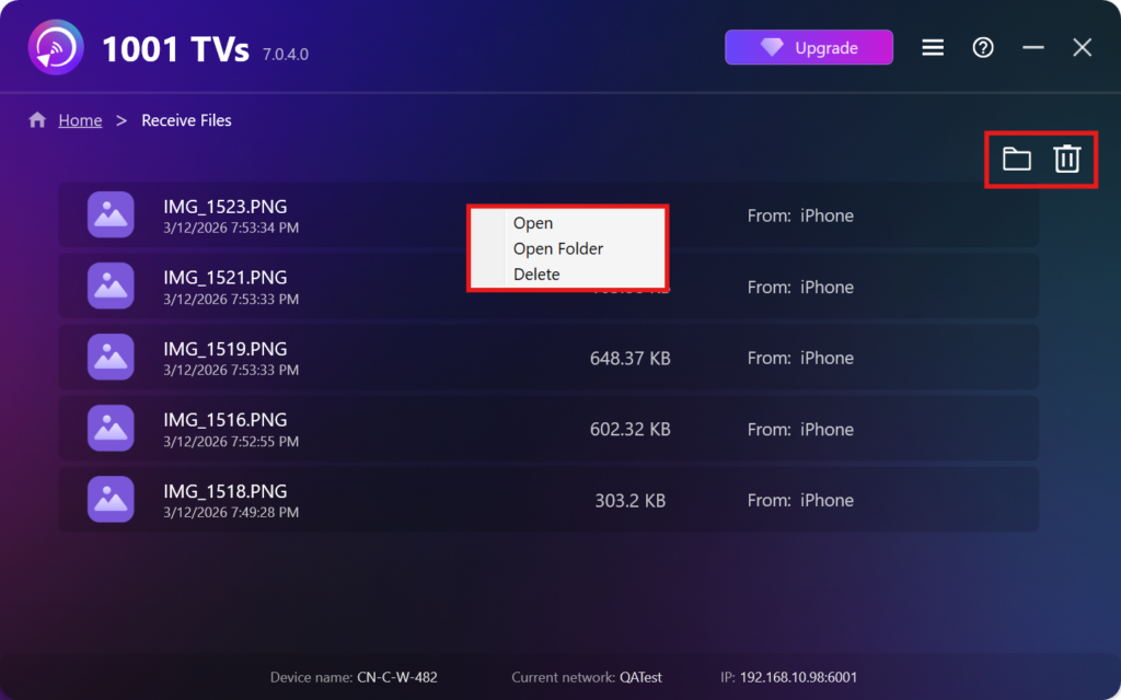 - Delete options – Right‑click a file and select “Delete” to remove it individually, or click the trash icon in the top‑right to delete all received files at once.