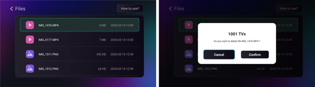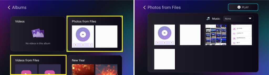 - Navegue até Albums > Photos/Videos from Files, where you can view received photos and videos, long‑press to delete, or play them as a slideshow.