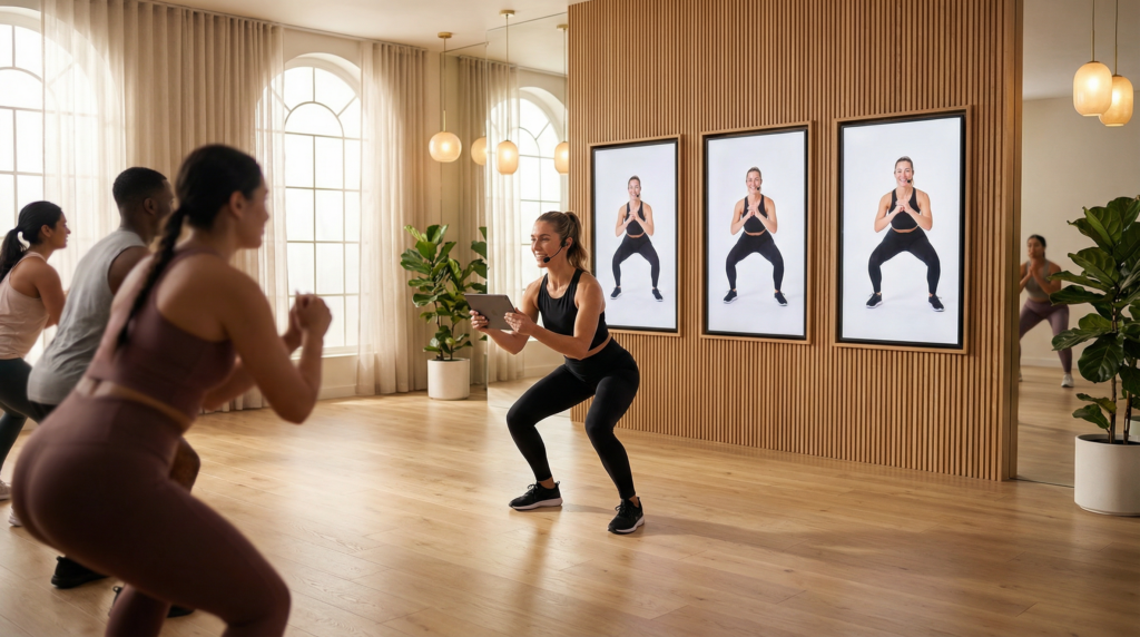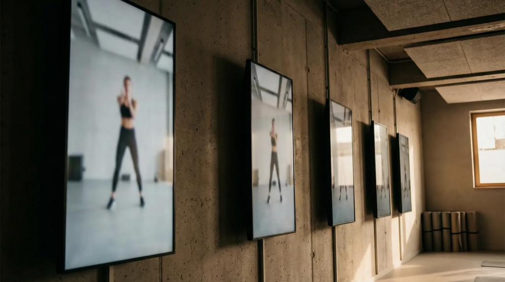 Многие бутиковые фитнес-студии используют дисплеи с портретным расположением для современных интерьеров.