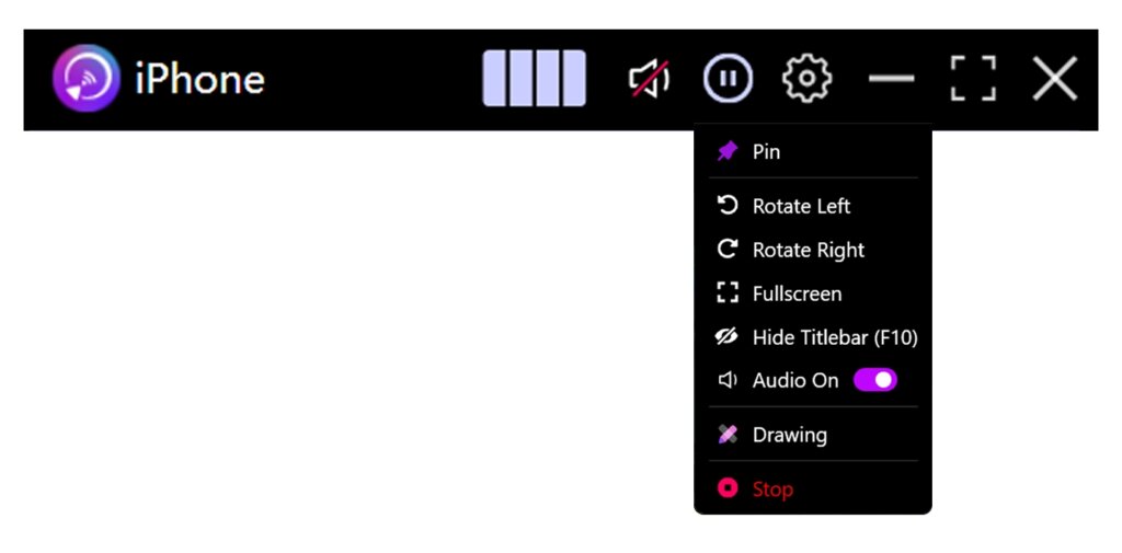 Başlık çubuğu ayrıca aşağıdakiler için kısayollar içerir Sessiz, Duraklat, Ayarlar, Minimize etmekve Tam Ekran, tek bir tıklama ile ortak eylemleri gerçekleştirmenize olanak tanır.