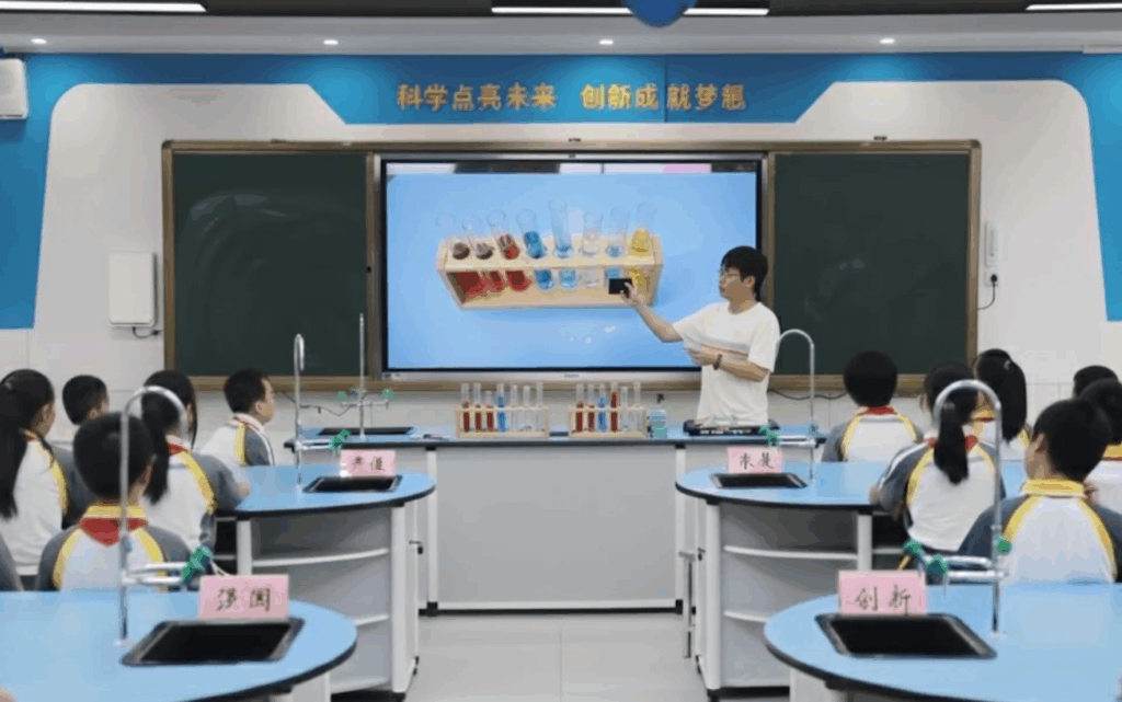 - Chemistry class: Color changes in the solution, tiny bubbles forming — mirrored and enlarged so everyone can watch closely.